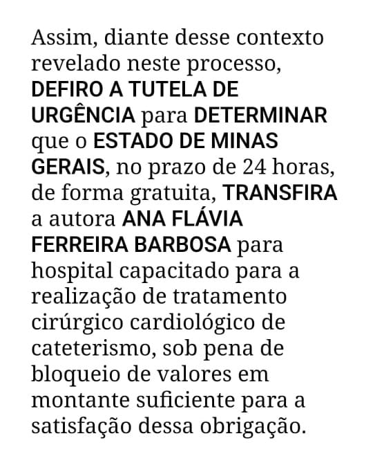 Em resposta à denúncia, o juiz Alex Matoso Silva concedeu uma liminar na manhã desta quarta-feira (23), determinando que o Estado de Minas Gerais transfira Ana Flávia para um hospital do SUS em Belo Horizonte, onde ela poderá realizar um cateterismo. A decisão estabelece um prazo de 24 horas para a transferência e menciona: “Assim, diante desse contexto revelado neste processo, DEFIRO A TUTELA DE URGÊNCIA para DETERMINAR que o ESTADO DE MINAS GERAIS, no prazo de 24 horas, de forma gratuita, TRANSFIRA a autora ANA FLÁVIA FERREIRA BARBOSA para hospital capacitado para a realização de tratamento cirúrgico cardiológico de cateterismo, sob pena de bloqueio de valores em montante suficiente para a satisfação dessa obrigação.”