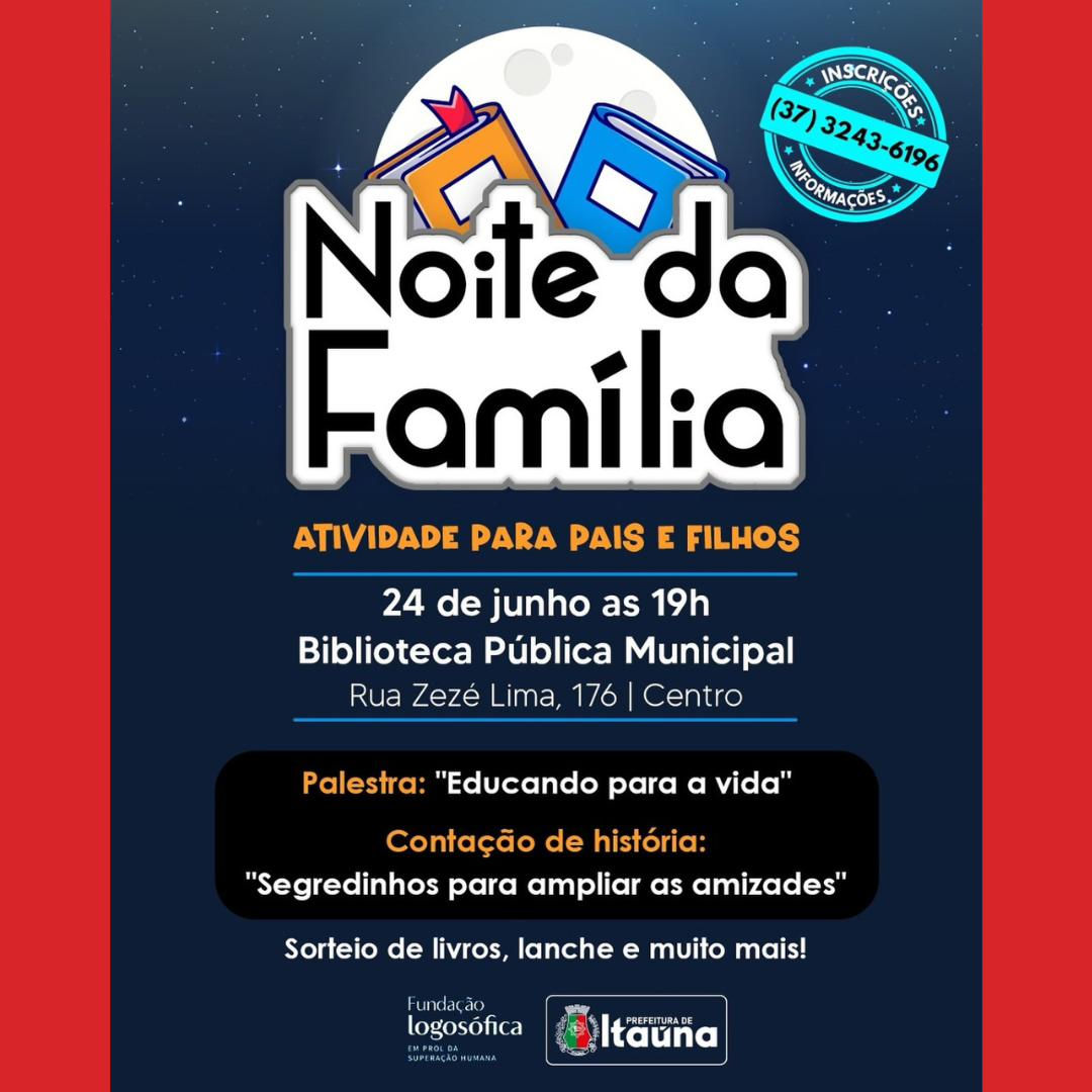 A Biblioteca Pública Municipal de Itaúna realizará, no dia 24 de junho, a “Noite da Família”, um evento voltado para pais e filhos, com atividades especiais que incluem palestra e contação de histórias.