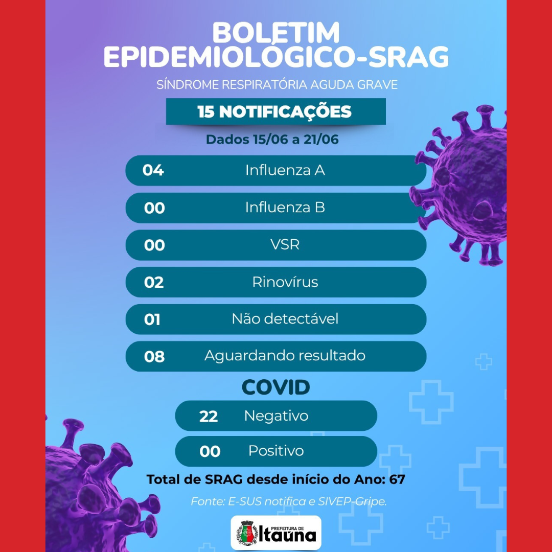 A Prefeitura de Itaúna divulgou o boletim epidemiológico da síndrome respiratória aguda grave (SRAG), com dados referentes ao período de 15 a 21 de junho de 2025. Nesse intervalo, foram registradas 15 notificações, com destaque para quatro casos confirmados de Influenza A.