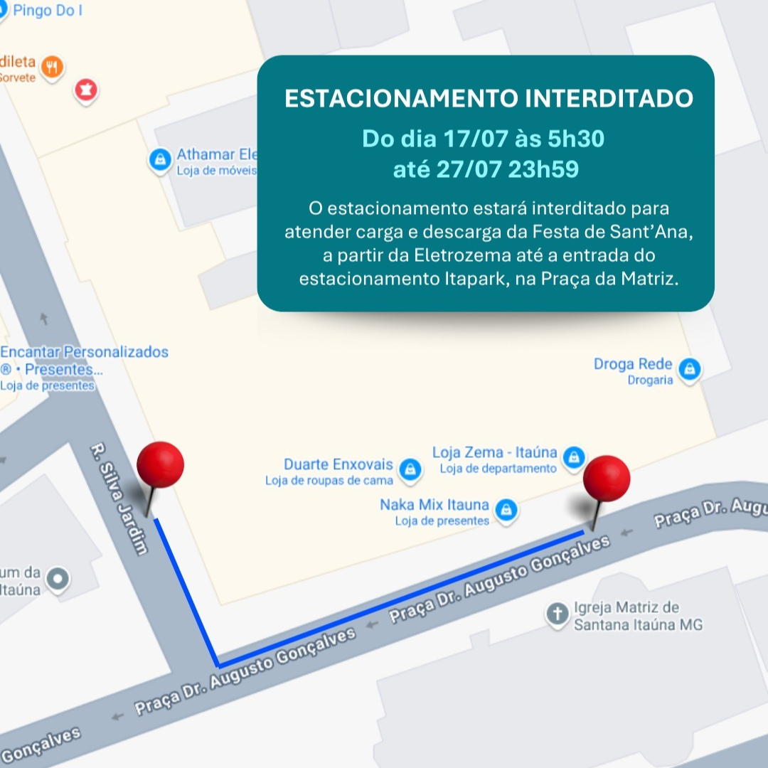 A Prefeitura de Itaúna informa que, entre os dias 17 e 27 de julho, o estacionamento localizado entre a loja Eletrozema e a entrada do estacionamento Itapark, na Rua Silva Jardim, Praça Dr. Augusto Gonçalves, estará interditado para operações de carga e descarga relacionadas à Festa de Sant’Ana.