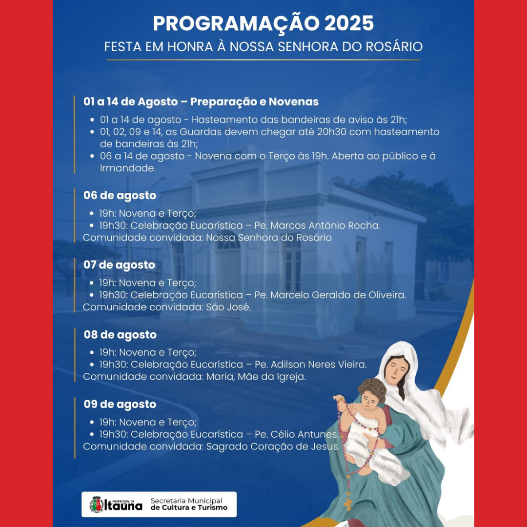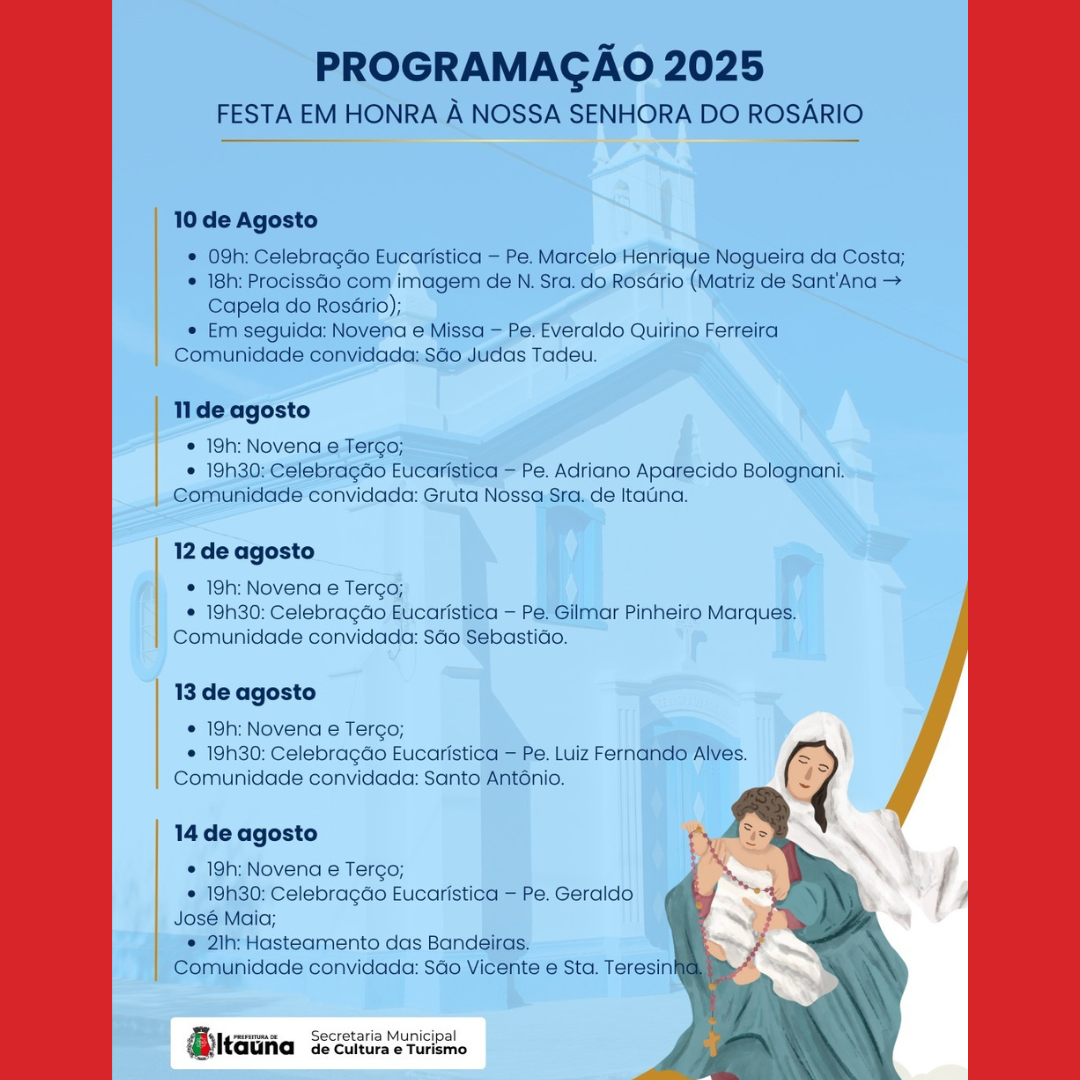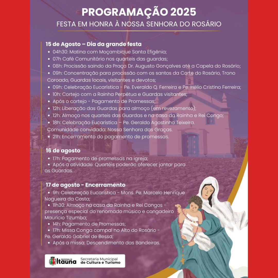 A tradicional Festa do Reinado de Nossa Senhora do Rosário já movimenta Itaúna desde o início de agosto, preparando a comunidade para o grande dia de celebração, marcado para 15 de agosto. Este evento religioso, que expressa a fé e mantém viva a cultura local, tem seu momento mais importante nas festividades realizadas ao redor das igrejas do Alto do Rosário, onde guardas e fiéis cumprem suas promessas em demonstrações de devoção.