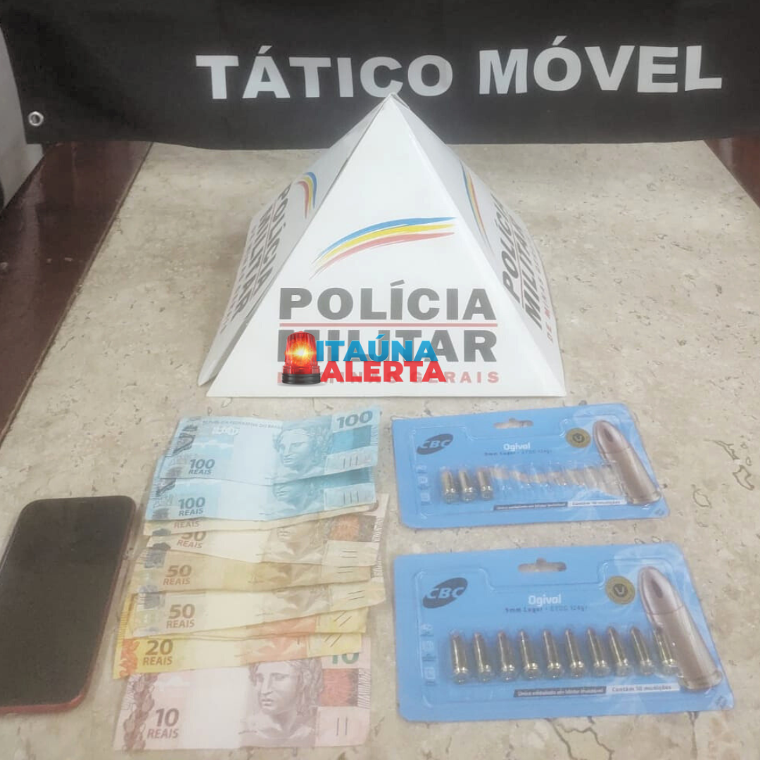 Durante as buscas na residência do suspeito, os policiais encontraram duas cartelas de munições calibre 9mm, totalizando 13 unidades, além de um aparelho celular e uma quantia em dinheiro.