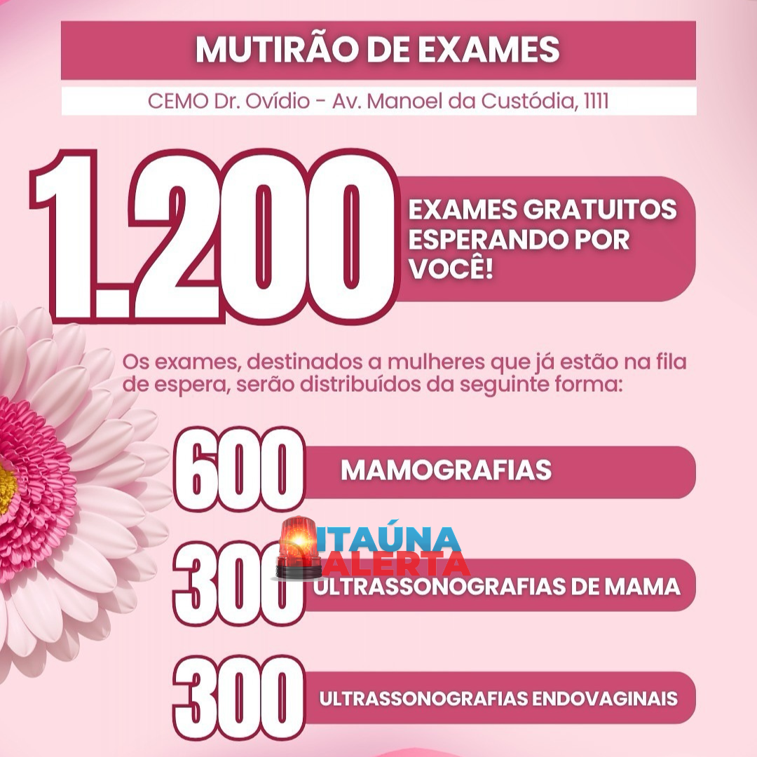 Além disso, será realizado um mutirão de exames no CEMO Dr. Ovídio (Av. Manoel da Custódia, 1111), destinado às mulheres que já estão na fila de espera. Ao todo, serão disponibilizados 1.200 exames gratuitos, sendo: