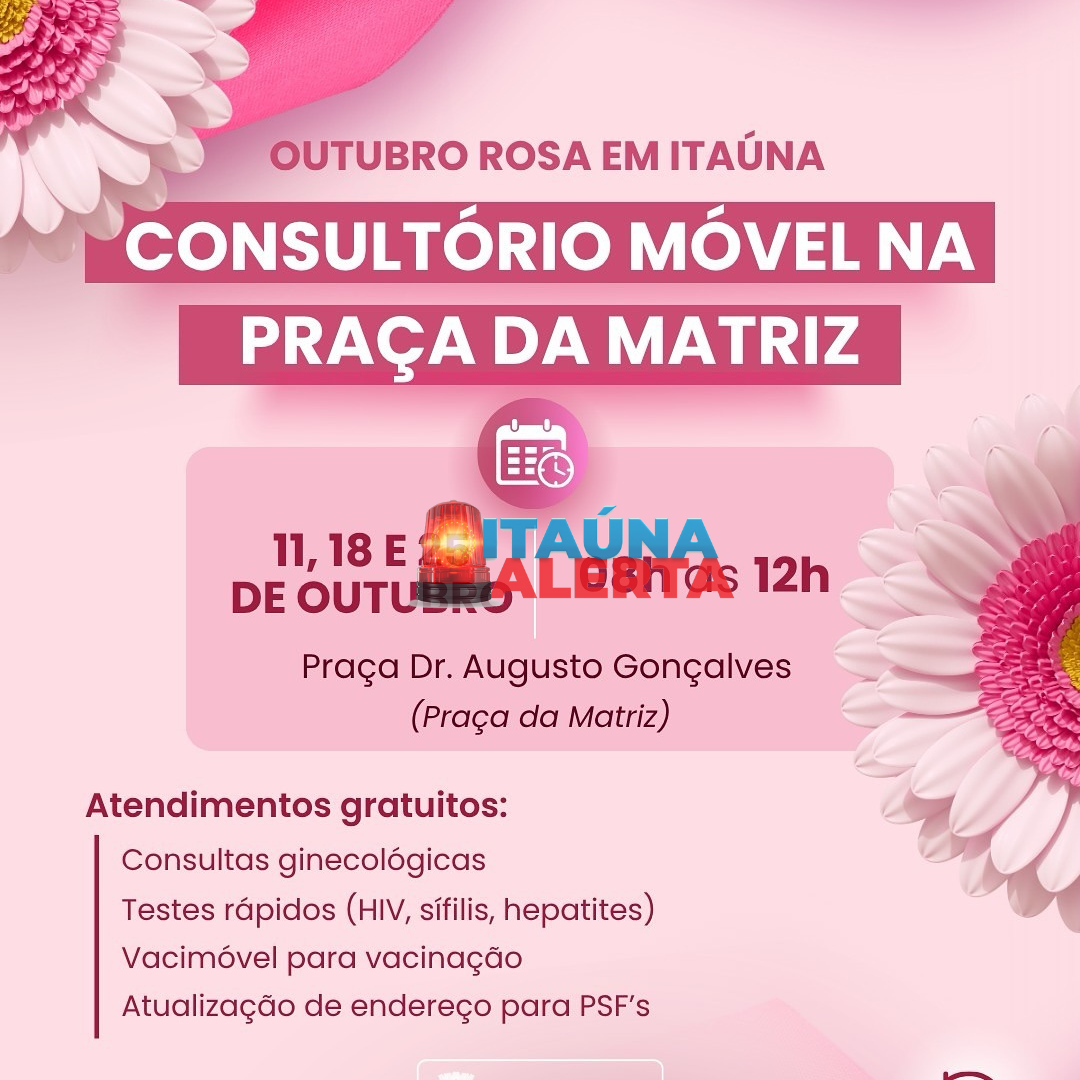 Nos dias 11, 18 e 25 de outubro, das 8h às 12h, o Consultório Móvel estará na Praça da Matriz (Praça Dr. Augusto Gonçalves). Serão oferecidos atendimentos gratuitos como consultas ginecológicas, testes rápidos para HIV, sífilis e hepatites, aplicação de vacinas pelo Vacimóvel e atualização de endereço para os PSFs.
