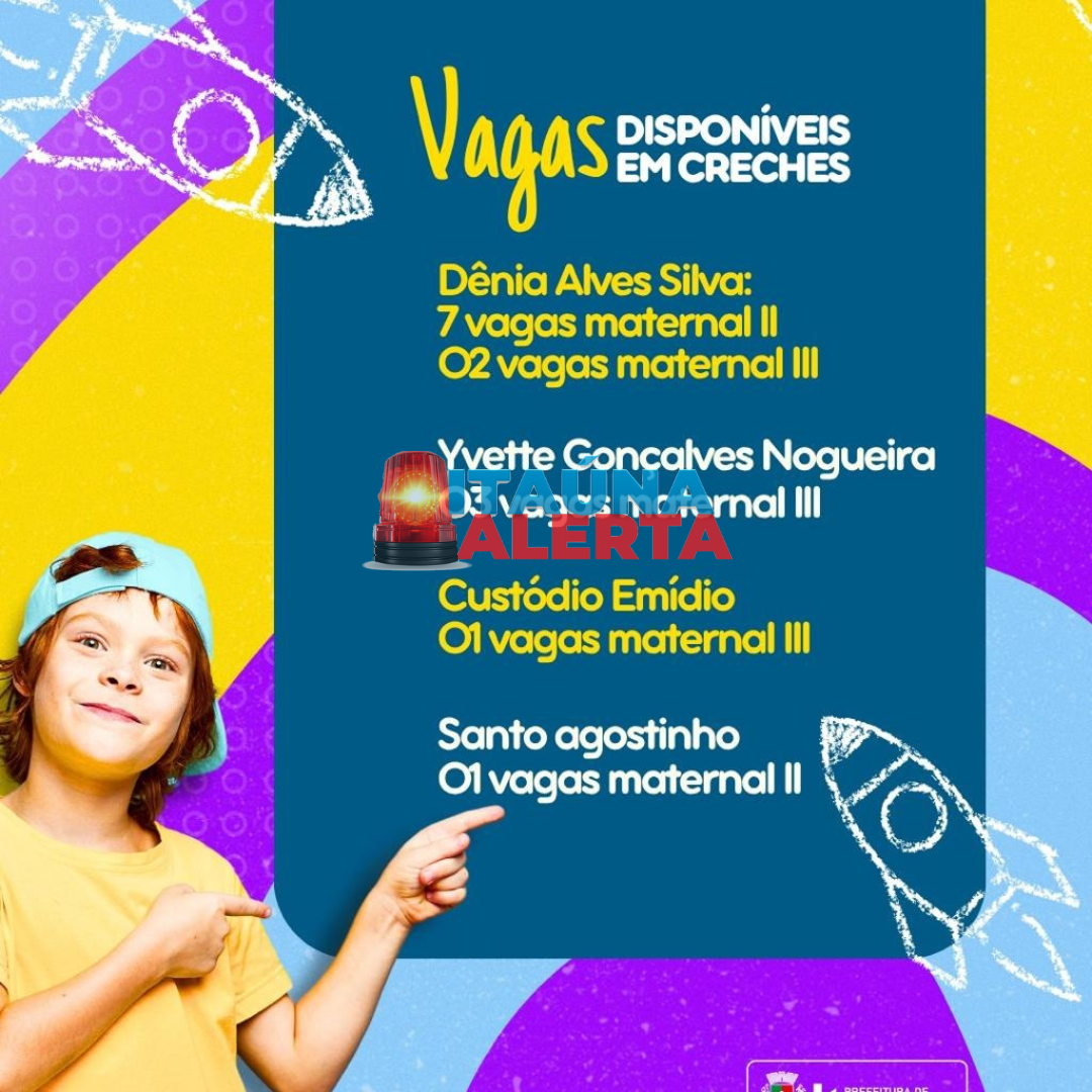 Prefeitura de Itaúna informou a abertura de novas vagas nas creches Dênia Alves Silva, Yvette Gonçalves Nogueira, Custódio Emídio e Santo Agostinho. As oportunidades são destinadas às turmas do Maternal II e III.