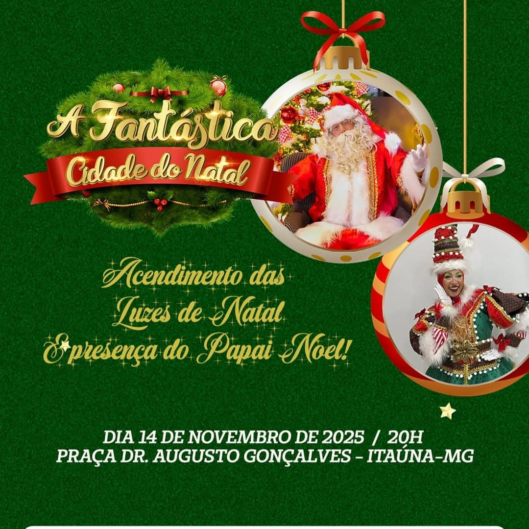 O Papai Noel e seu ajudante Elfo chegam a Itaúna no dia 14 de novembro para abrir oficialmente a Fantástica Cidade do Natal 2025. A festa começa às 20:00, na Praça Doutor Augusto Gonçalves, e marca o início da temporada natalina com o acendimento das luzes e um grande espetáculo musical com a Banda Sinfônica e a Bombeiro Instrumental Orquestra Show.