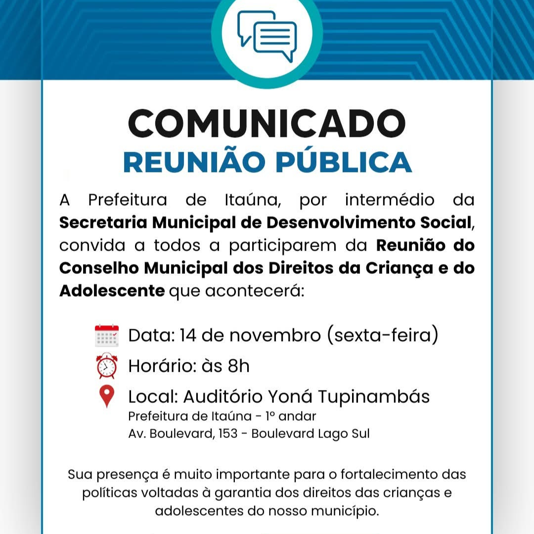 A Prefeitura de Itaúna, por meio da Secretaria Municipal de Desenvolvimento Social, promove nesta sexta-feira, 14 de novembro, uma reunião do Conselho Municipal dos Direitos da Criança e do Adolescente (CMDCA).