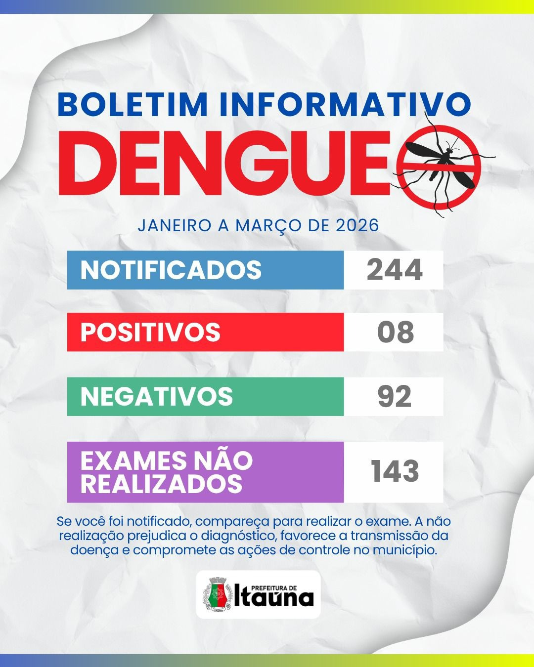 A Prefeitura de Itaúna divulgou o boletim informativo da dengue referente ao período de janeiro a março de 2026. Ao todo, foram registradas 244 notificações da doença no município.
