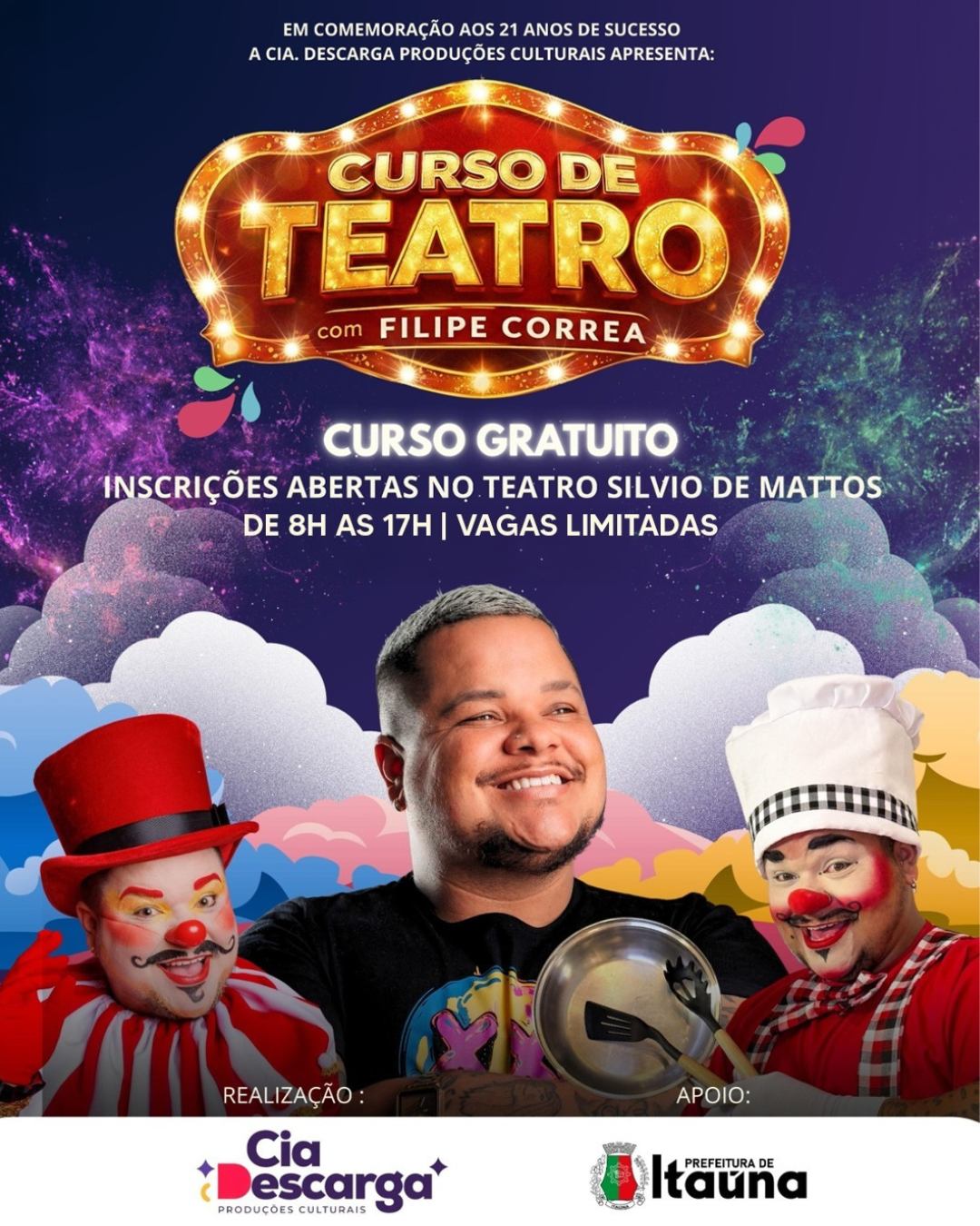 A Prefeitura de Itaúna, por meio da Secretaria Municipal de Cultura e Turismo, apoia a realização de dois cursos gratuitos promovidos pela Companhia Descarga Produções Culturais, em comemoração aos 21 anos de atuação do grupo. As atividades formativas acontecem no Teatro Sílvio de Mattos e são voltadas para adolescentes, jovens e adultos interessados em desenvolver habilidades artísticas e ampliar o contato com a cultura. São dois cursos oferecidos e ministrados pelo artista Felipe Correia: um curso de teatro e outro de formação para besteirologistas, modalidade ligada à arte da palhaçaria com foco em intervenções sociais. A iniciativa integra as ações de incentivo à formação cultural e à valorização das artes cênicas no município. O curso de teatro propõe trabalhar elementos de expressão corporal, criatividade, comunicação e desenvolvimento pessoal por meio da linguagem teatral. A formação busca estimular a sensibilidade artística, a autoconfiança e a capacidade de expressão dos participantes, promovendo o contato com práticas que contribuem para a formação cultural e cidadã. Já o curso de besteirologistas tem como proposta preparar artistas para atuar como palhaços em ações sociais, especialmente em visitas a instituições e espaços de acolhimento. A formação valoriza o riso, a empatia e a arte como instrumentos de humanização e transformação social. As duas formações terão duração de seis meses e serão realizadas nas dependências do Teatro Sílvio de Mattos, equipamento cultural mantido pela Prefeitura de Itaúna e que tem se consolidado como importante espaço para apresentações, oficinas e atividades de formação artística. As inscrições são gratuitas e devem ser realizadas presencialmente no Espaço Cultural Adelino Pereira Quadros, localizado na Rua Antônio Corradi, nº 55, no Centro, de segunda a sexta-feira, das 8h às 17h. As vagas são limitadas. As aulas já começaram e acontecem todas as quartas-feiras, das 18h às 19h e das 19h às 20h. Com o apoio à iniciativa, a Prefeitura de Itaúna reforça seu compromisso com o fortalecimento das políticas públicas de cultura, incentivando projetos que ampliem o acesso da população à formação artística e estimulem o surgimento de novos talentos no município. Da redação com informações da Prefeitura de Itaúna