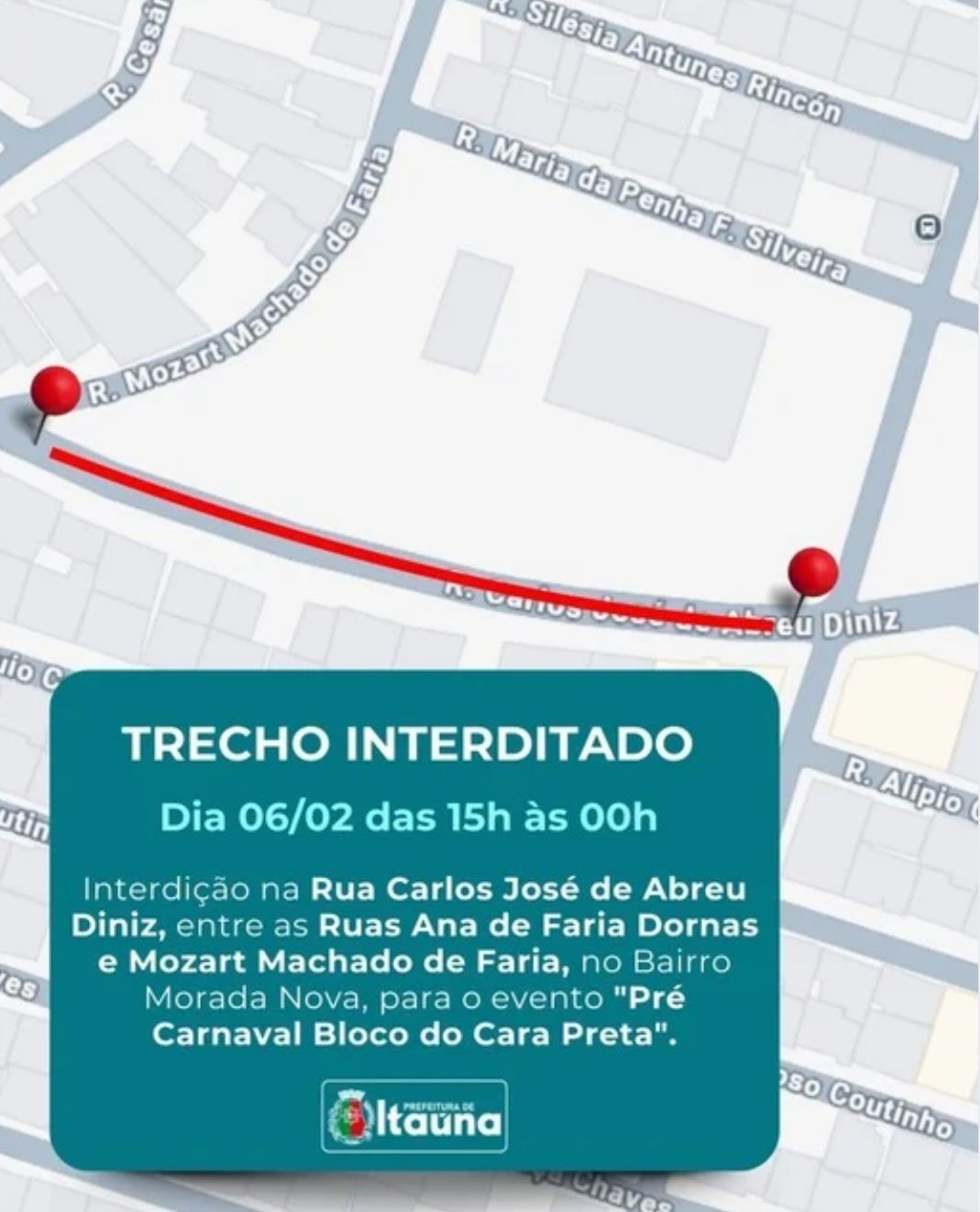 A Gerência Superior de Trânsito e Transporte informou que a Rua Carlos José de Abreu Diniz será interditada nesta sexta-feira (06), de 15:00 à meia-noite, no bairro Morada Nova, para a realização do evento “Pré-Carnaval Bloco do Cara Preta”. A interdição ocorre no trecho entre as ruas Ana de Faria Dornas e Mozart Machado de Faria. Durante o período, o trânsito será liberado apenas para moradores residentes no local do evento. A orientação é que os motoristas utilizem rotas alternativas e fiquem atentos à sinalização. Por Fábio Melo