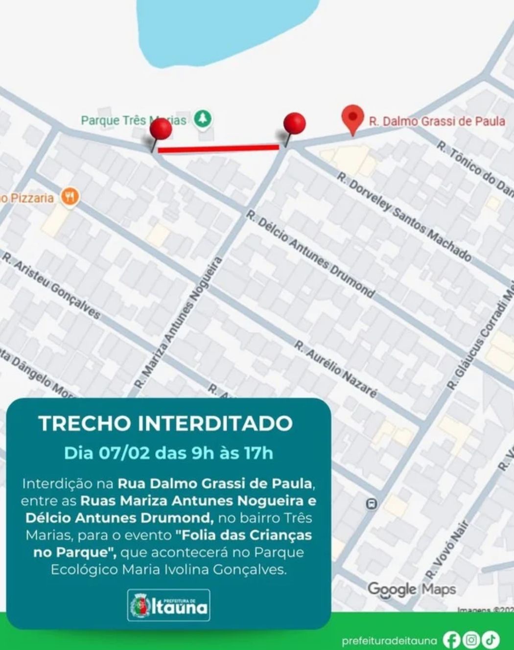 A Gerência Superior de Trânsito e Transporte informou que a Rua Dalmo Grassi de Paula será interditada neste sábado (7), das 9h às 17h, no bairro Três Marias. A interdição ocorre no trecho entre as ruas Mariza Antunes Nogueira e Délcio Antunes Drumond. A medida será necessária para a realização do evento “Folia das Crianças no Parque”, que acontece no Parque Ecológico Maria Ivolina Gonçalves. De acordo com a gerência, o trânsito estará liberado apenas para moradores residentes no local do evento. Motoristas que trafegam pela região devem redobrar a atenção e buscar rotas alternativas durante o período de interdição. Da redação com informações da Prefeitura de Itaúna