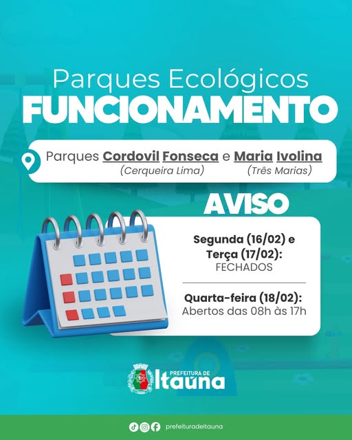 Os parques ecológicos Cordovil Fonseca, no bairro Cerqueira Lima, e Maria Ivolina, no bairro Três Marias, estarão fechados ao público na segunda-feira (16) e na terça-feira (17). A interrupção temporária ocorre para a realização de serviços de organização e manutenção dos espaços. De acordo com a Prefeitura de Itaúna, a medida tem como objetivo garantir melhores condições de uso, conforto e segurança para os frequentadores. O funcionamento será retomado na quarta-feira (18), com atendimento ao público de 08:00 à s17:00. A administração municipal pede a compreensão da população e reforça a importância da colaboração de todos para a preservação dos parques, que são importantes áreas de lazer e contato com a natureza. D a redação com informações da Prefeitura de Itaúna