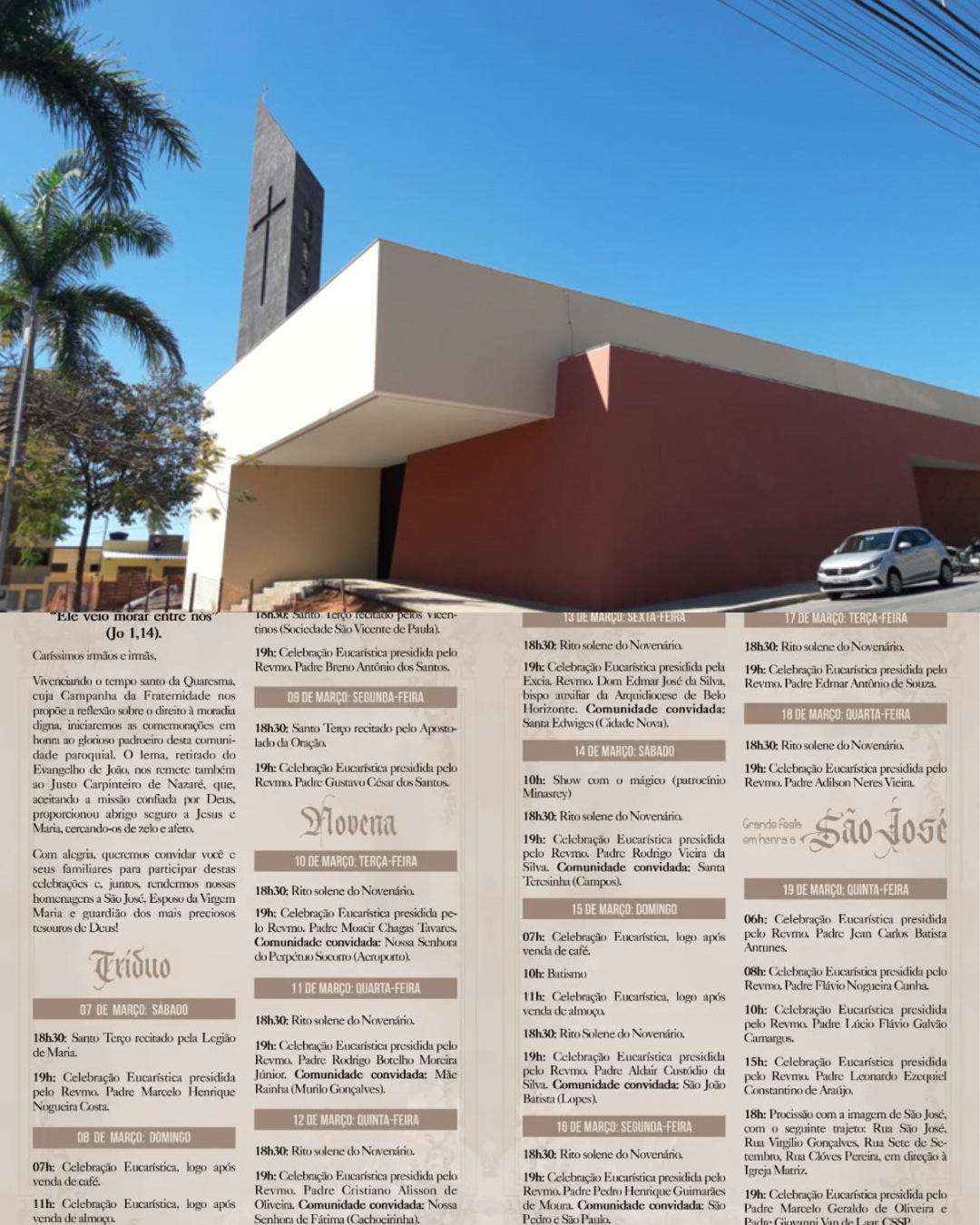 Itaúna se prepara para celebrar a tradicional Festa de São José, que será realizada no Parque São José, no bairro Garcias. A programação religiosa e festiva começa no dia 7 de março e segue até o dia 19, data dedicada ao santo. A abertura será no sábado (07), às 18:30, com a celebração do terço seguida de missa presidida pelo padre Marcelo Henrique Nogueira Costa. Durante todo o período da festa, haverá novena diária às 18h30, seguida de celebrações eucarísticas presididas por diversos sacerdotes convidados da região. Além das celebrações religiosas, a festa também contará com momentos de confraternização para a comunidade. Durante os dias do evento haverá shows e barraquinhas com comidas típicas, além de café e almoço aos domingos. A programação inclui ainda atividades especiais, como show com mágico no dia 14 de março, após a missa da novena. No dia 19 de março, data dedicada a São José, as comemorações começam às 8h com missa. Ao longo do dia serão celebradas outras missas, às 10:00 e às 15:00. Às 18:00 haverá procissão com a imagem de São José pelas ruas do bairro Garcias, seguida de celebração eucarística presidida pelo padre Marcelo Geraldo de Oliveira e pelo padre Giovanni Vian de Lara. A festa é organizada pelo Conselho Pastoral e pelo Conselho Administrativo e Econômico Paroquial, com o objetivo de promover momentos de fé, devoção e convivência entre os fiéis. A Paróquia São José está localizada na Praça Alfredo Gonçalves de Souza, nº 73, no bairro Garcias, em Itaúna. Por Fábio Melo