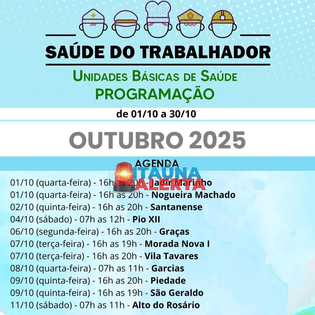 A Prefeitura de Itaúna, por meio da Secretaria Municipal de Saúde, divulgou a programação do Saúde do Trabalhador nas Unidades Básicas de Saúde (UBS) durante o mês de outubro de 2025. O objetivo é oferecer atendimentos em horários estendidos, facilitando o acesso de trabalhadores aos serviços de saúde. As ações acontecerão em diversas regiões da cidade, entre os dias 1º e 30 de outubro, sempre em horários diferenciados, de acordo com a unidade de saúde. A programação inclui atendimentos em bairros como Jadir Marinho, Nogueira Machado, Santanense, Pio XII, Graças, Morada Nova, Vila Tavares, Garcias, Piedade, São Geraldo, Alto do Rosário, Central, Itaunense, Irmãos Auler, Lourdes, Morro do Engenho e Várzea da Olaria. A Secretaria reforça que cada equipe de Estratégia de Saúde da Família (ESF) é responsável pelas atividades e atendimentos de sua área de abrangência. Por isso, os moradores devem procurar a unidade de referência do seu bairro para obter informações detalhadas sobre os serviços oferecidos. Da redação com informações da Prefeitura de Itaúna